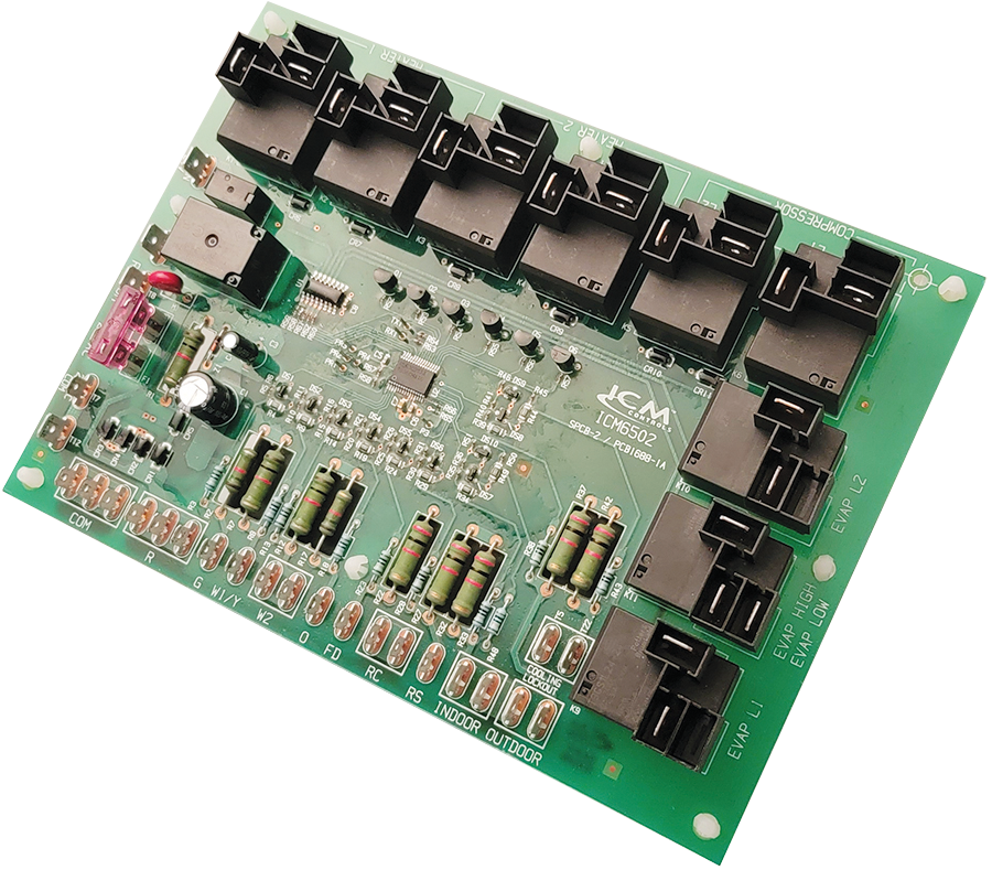 The ICM6502 is a package unit heat pump control board designed to provide control of the compressor, reversing valve, auxiliary heat elements, the condenser and evaporator fans. The ICM6502 also accepts inputs from a thermostat, indoor coil temperature, outdoor coil temperature, outdoor ambient temperature, indoor room temperature and a shutdown switch (front desk). The ICM6502 provides compressor protection from short cycling with an anti-short cycle timer and low ambient lockout. A built-in defrost cycle will protect the outdoor coil from freezing up when in heating mode.