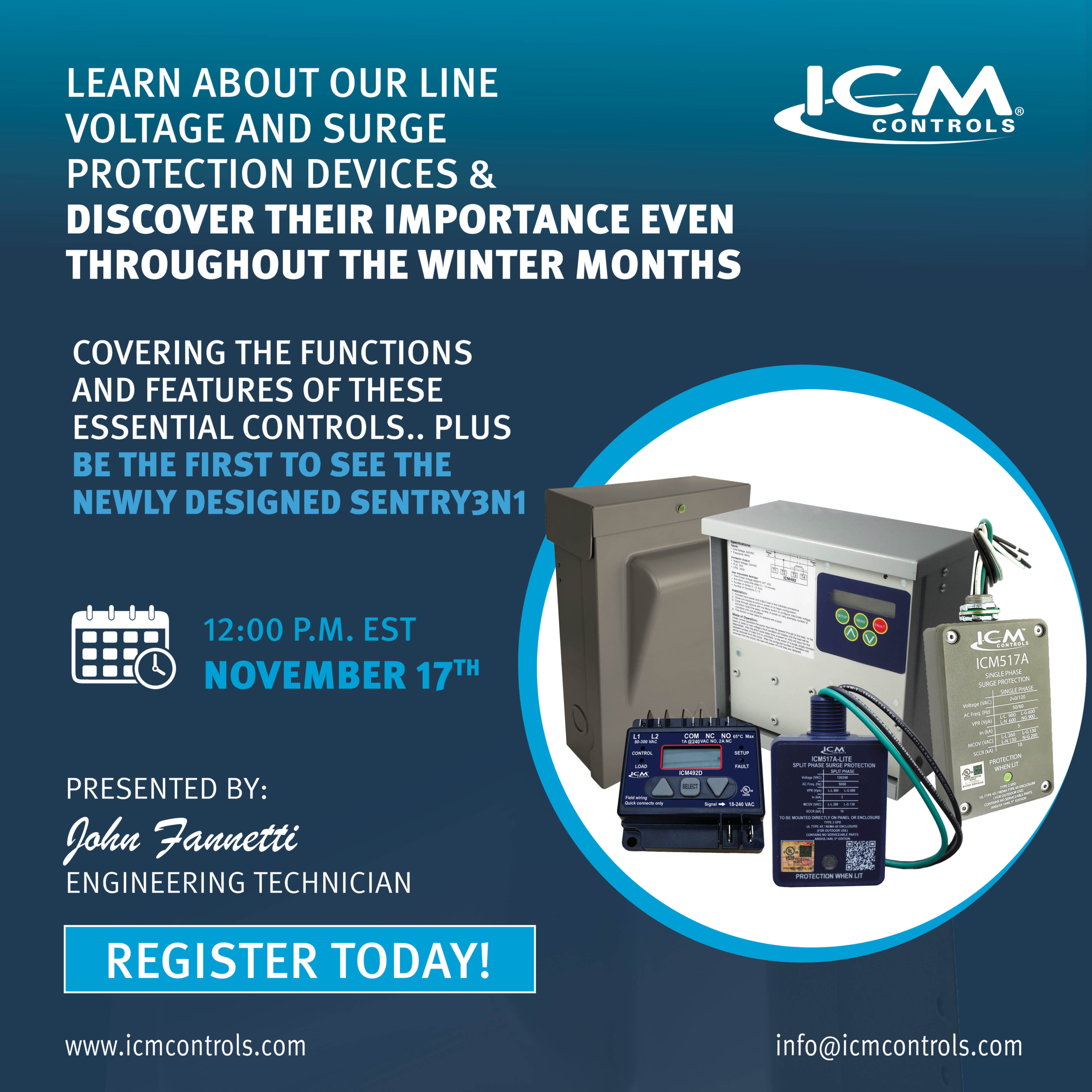 Join ICM Controls on November 17th at 12:00 p.m. for an exclusive webinar showcasing our line voltage monitoring and surge protection devices! Learn how they play a key role even in the winter months ahead.