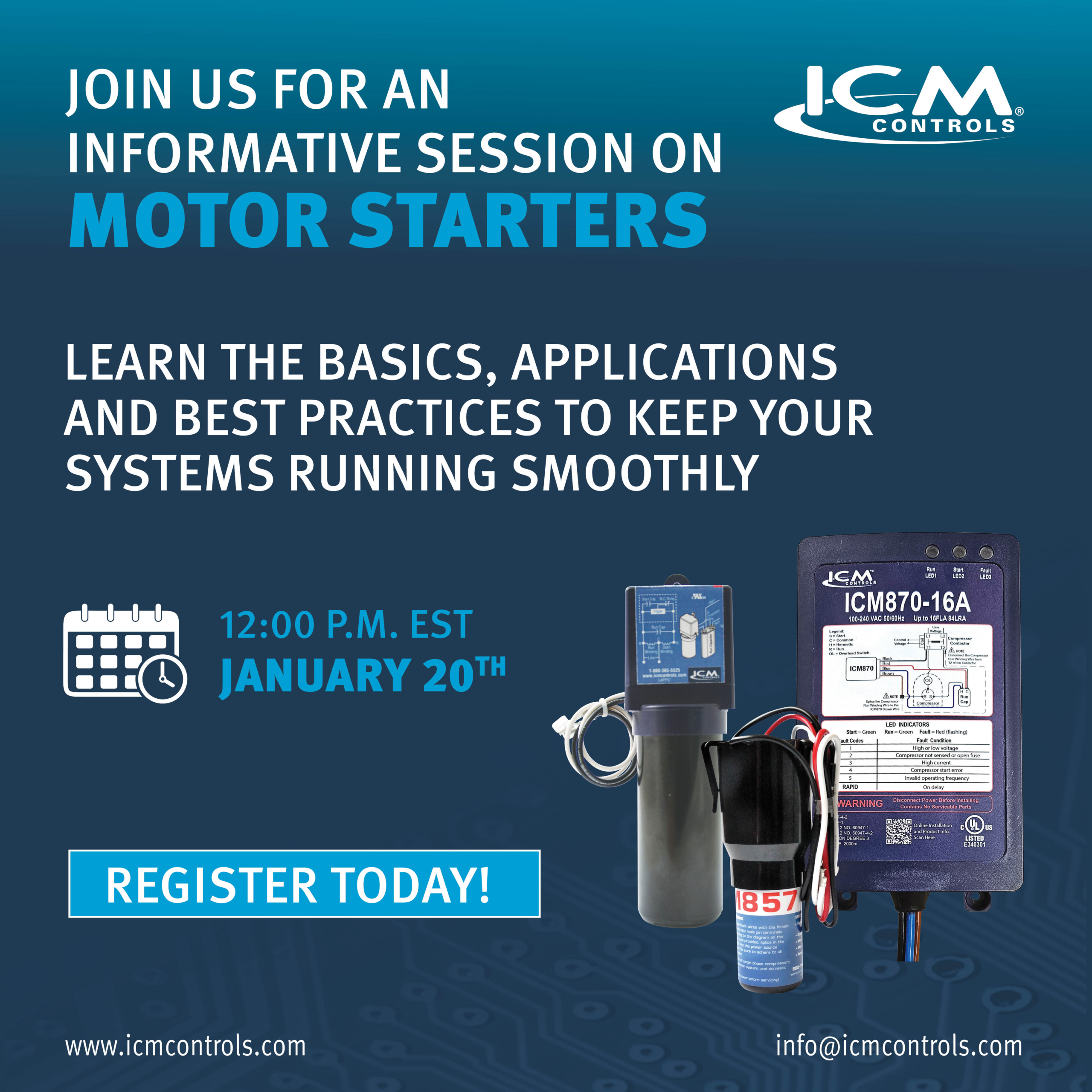 Join ICM Controls on Tuesday, January 20th at 12:00 p.m. for an exclusive webinar showcasing our motor starters! Learn the basics, applications and best practices to keep your systems running smoothly.