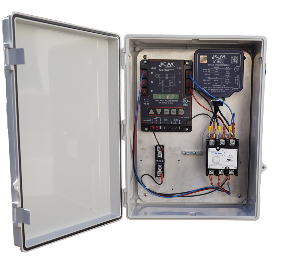 The 3VMS combines the benefits of the ICM450A PLUS+ programmable 3-phase line voltage monitor and a ICM530 type 1 and type 2 three-phase Surge Protective Device (SPD) into one easy-to-install solution. The 3VMS protects against both power surges and over/ under voltage issues that can cause damage to circuit boards and motors in residential and commercial three-phase 208VAC HVAC/R equipment.- All Components pre-wired for 208VAC