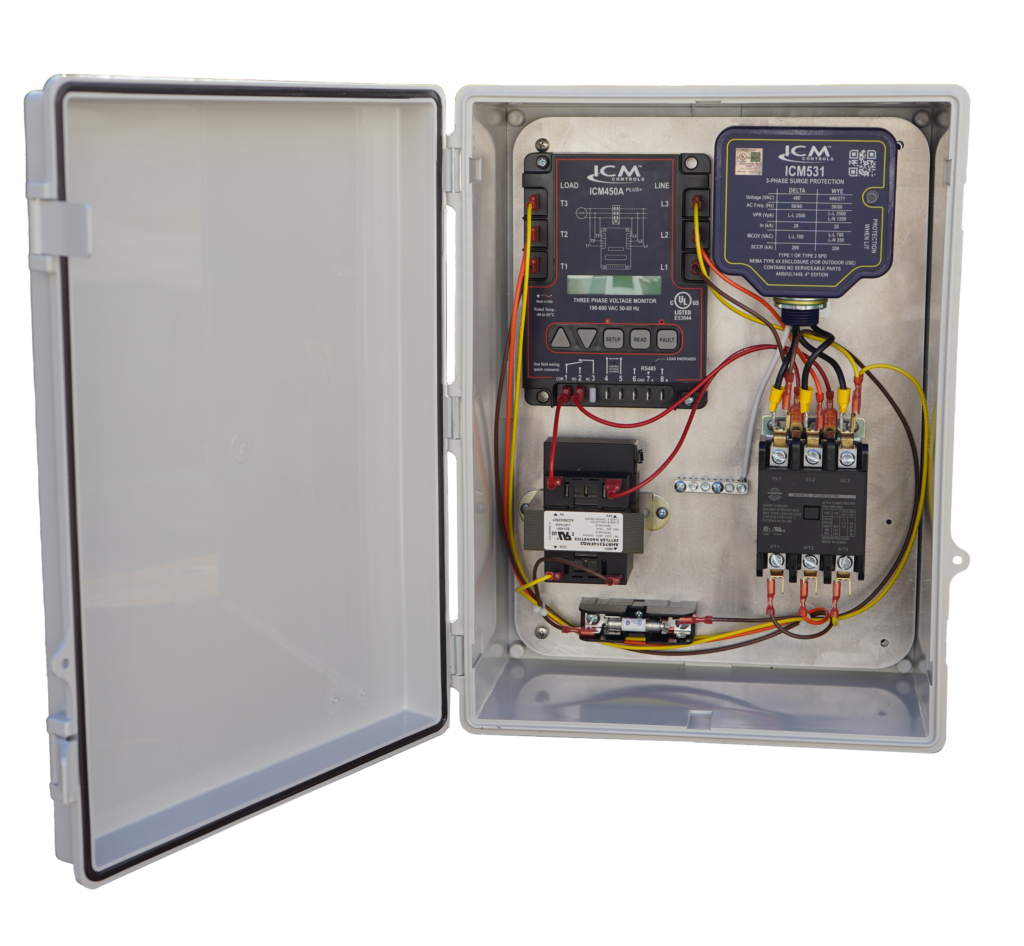 The 3VMS combines the benefits of the ICM450A PLUS+ programmable 3-phase line voltage monitor and a ICM531 type 1 and type 2 three-phase Surge Protective Device (SPD) into one easy-to-install solution. The 3VMS protects against both power surges and over/under voltage issues that can cause damage to circuit boards and motors in residential and commercial three-phase 480VAC HVAC/R equipment.- All Components pre-wired for 480VAC