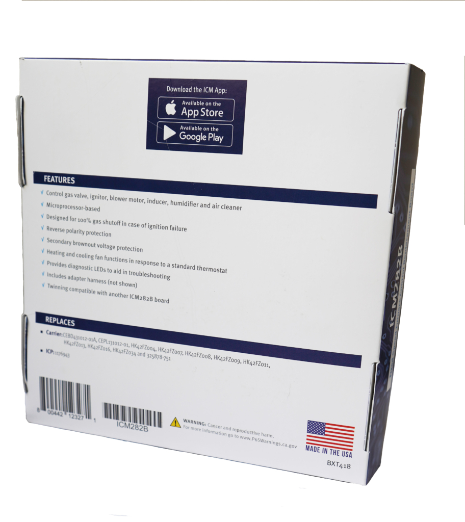The ICM282B is a popular, low cost, OEM replacement furnace control for the Carrier HK42FZ034, HK42FZ004/007/008/009/011/013/016. It controls gas valve, ignitor, blower motor, inducer, humidifier and air cleaner.- Popular replacement for Carrier HK42FZ004/007/008/009/011/013/016/034