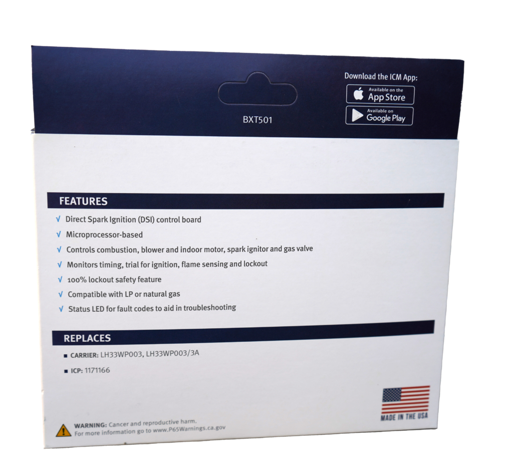 The ICM291 control is low-cost form, fit and functional replacement board for Carrier: LH33WP003A circuit boards. It controls inducer fan motor, blower fan and monitors limit switches. The ICM291 has incorporated LED diagnostics to assist in troubleshooting. Fault code information can be found in the application guide. Please refer to the application guide with the furnace installation manual for future reference.- Low-cost form, fit and functional replacement for Carrier: LH33WP003A