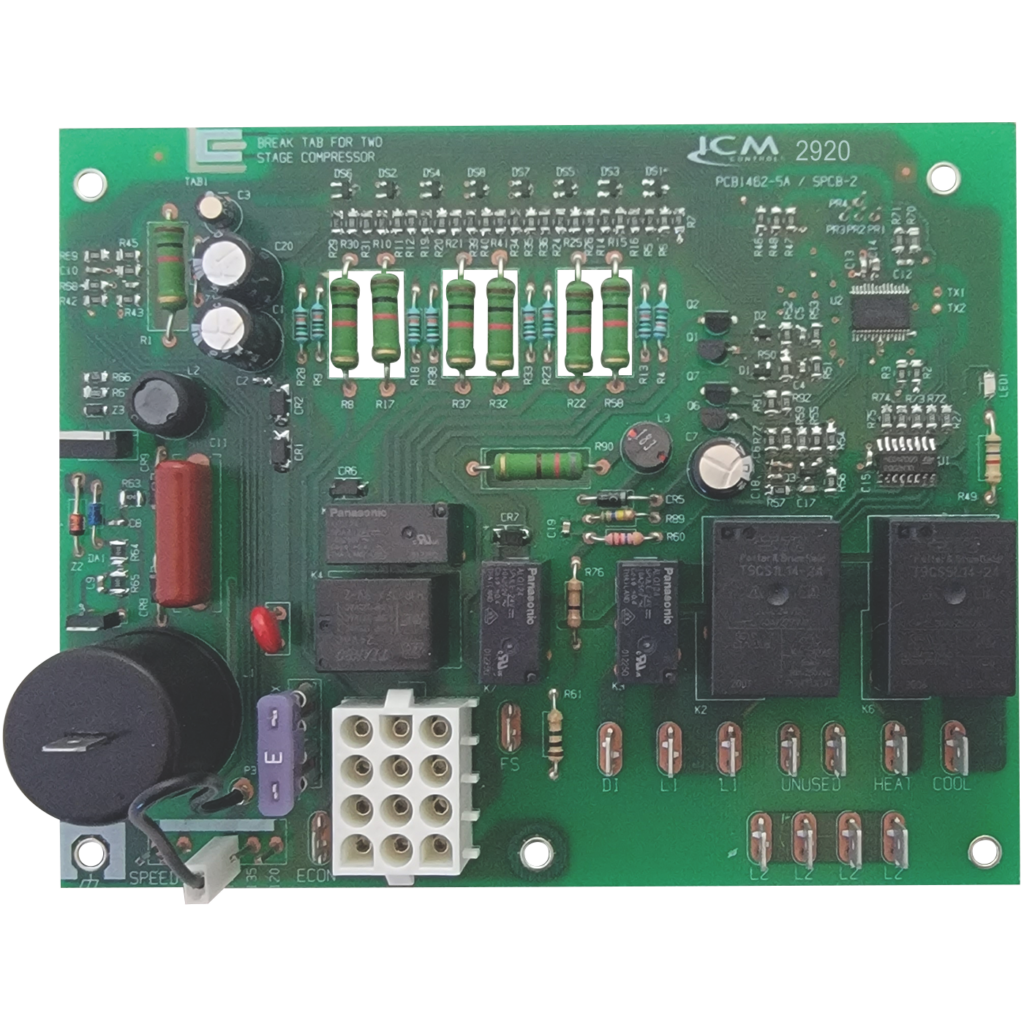 The ICM2920 is a form, fit, and functional replacement for the furnace control boards shown in the cross-reference section of this guide. The ICM2920 is an automated gas ignition control board that monitors the ignition sequence including the inducer, pressure switch, spark ignition, gas valve, flame sense, and circulating blower while maintaining complete safety circuit monitoring including the high limit switch, roll out switch, and auxiliary limit switch circuits.- Controls blower motors, gas valve, & spark ignitor in sequence
